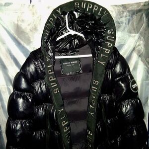 designed to a Moncler coat also same quality warm and stylish with this sleek black puffer jacket featuring green accents. Perfect for any winter wardrobe.