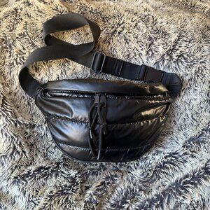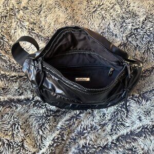 Lightweight and stylish black puffy-style crossbody bag. Perfect size for daily essentials with an adjustable strap for versatile wear.