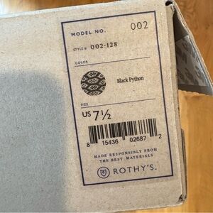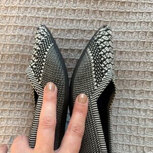Gently worn Rothy's pointed toe flats in black python pattern. These have been washed and air dryed. There are a couple of spots that look a little bit dark on the sides of the ball of foot area (shown in photos) they’re not super obvious, just noticed while taking these photos.