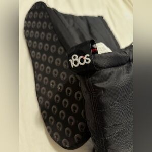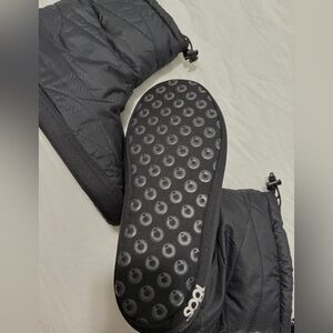 Cozy black quilted booties with non-slip soles. Perfect for keeping warm indoors.