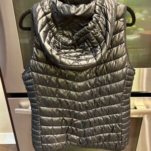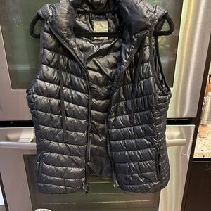 This sleek black puffer jacket features a quilted design and a high collar for added warmth. Its hip-length cut makes it perfect for layering during cooler weather. The attached hood provides extra protection against the elements.