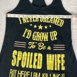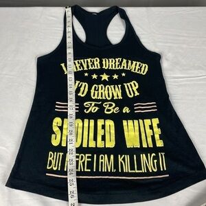 I never dreamed I’d grow up to be a spoiled wife but here I am, killing it! Cute black tank top with yellow graphic. No tags, appears to be a small. Please see measurements in pictures.