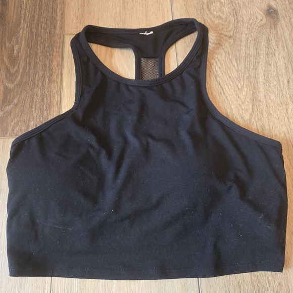 Sleek black racerback sports bra. Perfect for workouts. Fabletics sz M. racerback. high neck. built in bra.