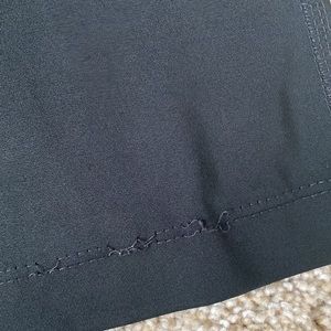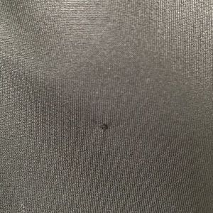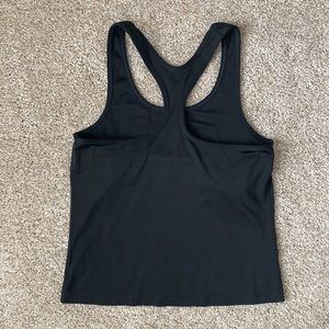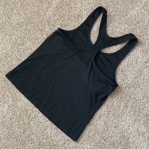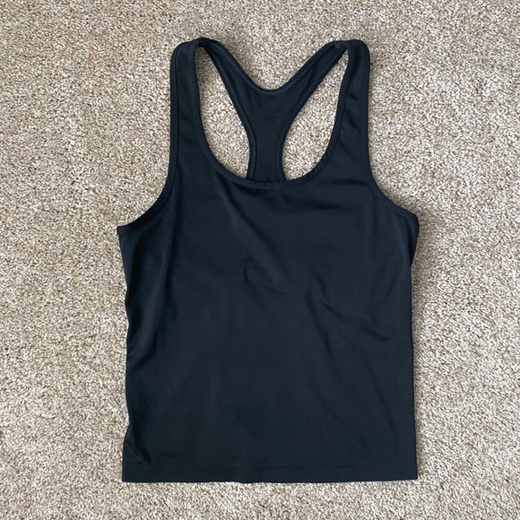 Sleeveless Cut. Round Neckline. Racerback. Basic Black Design. Built In Bra (not padded). Interior Fabric Tag. Small Snag and Minimal Loose Stitching (see last two pictures).