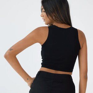 This is an essential piece to add to your closet with the perfect everyday look. It has a high neckline, racerback detail, and is a mid length crop top. This brami has no shelf bra inside, so it offers lower support and is very high in comfort.
