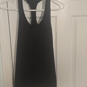 This black tank top features a racerback design and sleeveless cut, offering a sporty and versatile look. Made from a stretchy, form-fitting fabric, it's perfect for exercise or casual wear. The simple design makes it an essential piece for layering or standalone wear.