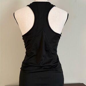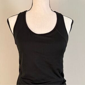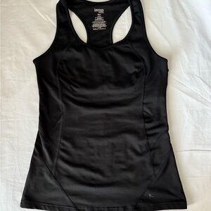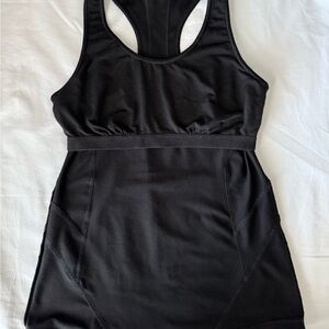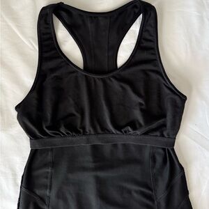 Sleek and stylish black racerback tank top with built-in bra. Perfect for any active or casual occasion. Enjoy comfort and elegance in one piece.