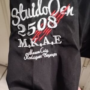 Stylish black racing jacket with embroidered logos. Perfect for motorsport enthusiasts.