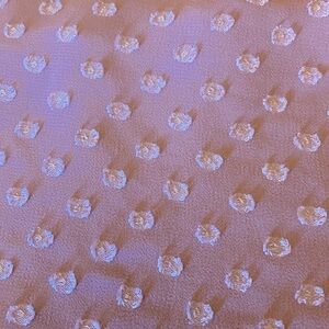 Pretty lined chiffon blouse with raw edge fabric polka dots. Notch neckline has self tie bow. Popover styling. Sheer bishop sleeves with elastic cuffs. Polyester lining under polyester chiffon overlay. Excellent condition, no flaws noted.