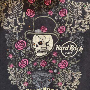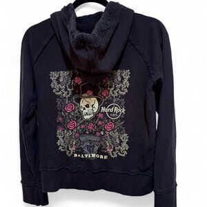 Hard Rock Cafe 100% cotton hoodie size large from late 00s. Rare and super cool. Excellent used condition. I wore it a few times and then it got washed and placed in storage. Finally clearing out and selling most of my storage. Bejeweled with little crystals and the threads on hoodie were like that when purchased, it's the style to make it look rocker and grungy. From city of Baltimore specifically if a HRC collector.
