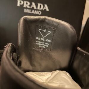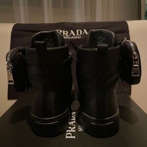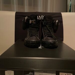 Wheel Re-Nylon high-top sneakers are a Prada classic. High top lacing sneakers, enamel triangle logo, removable pouch, round head, front lace, insole decorated with brand logo, clasp. Shoe is new, never worn.This sneaker is size 36 with box and shoe bag , For true size 6. If wear between size 6 and 6 1/2, this sneaker will not fit.