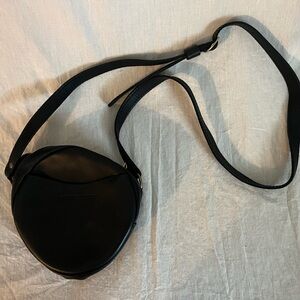 Stylish round Leather black crossbody bag with adjustable strap. Perfect for everyday use.