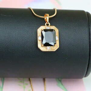 Striking and elegant, this black pendant is set in a radiant gold frame with shimmering accent stones for added luxury.