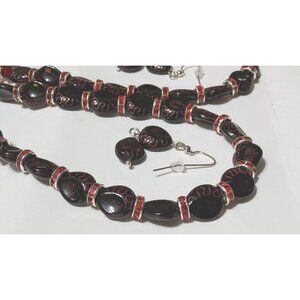 This elegant necklace and earring set combines black and red beads with intricate detailing, offering a sophisticated accessory for various styles.