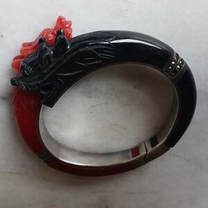 Black & Red Carved Jade Nephrite Dragon Sterling Silver Bangle