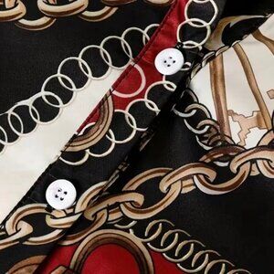 Turn every entrance into a moment with this black and red chain print button-up blouse. Designed in a luxe baroque-inspired pattern with gold chains and scarf-style details, this long sleeve shirt brings rich color and attitude to any outfit. The silky satin-style fabric drapes smoothly, while the classic collar, button front, and cuffed sleeves keep it polished and wearable.