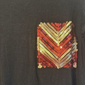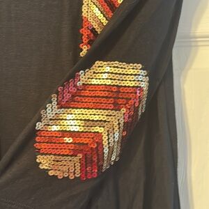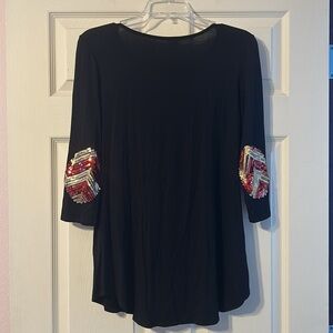 Black 3/4 sleeve tunic blouse with Red & Gold Sequin Accent on back of elbows and front pocket, size Small. Armpit to armpit 15 inches. Back of neck to bottom is 29 inches. 95% rayon 5% spandex. New without tags from a smoke free home.