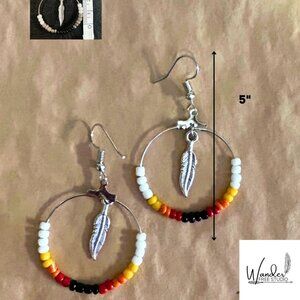 Same Day Shipping! Handmade beaded hoop earrings! Each pair is carefully crafted featuring a unique blend of glass beads and finished with a delicate silver feather charm that hangs gracefully in the center. Product Details: Handmade with silver plated fish hook earrings & hoop Size: approx. 3" wide x 5" long Color: White, yellow, Orange, Red & Black Materials: Glass beads, silver-tone metal, feather charm Lightweight and comfortable for all-day wear Please message me with and questions!