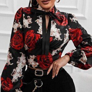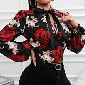 Black & Red Preppy Womens Floral Print Lantern Sleeve Tie Neck Blouse