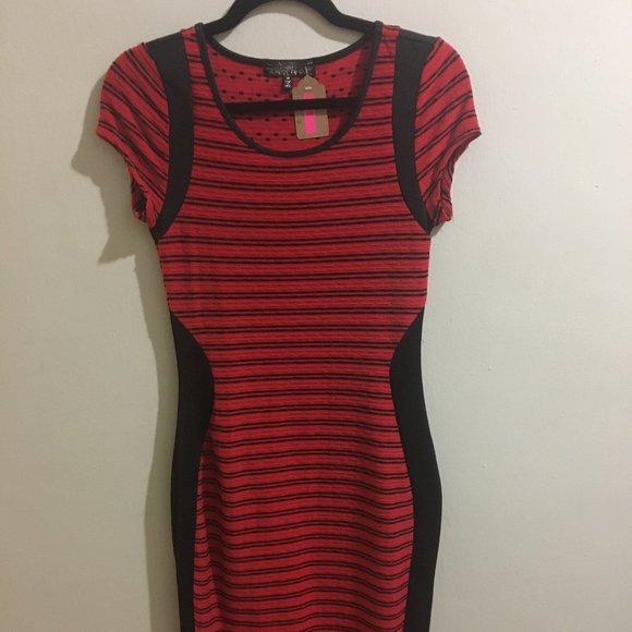 JVGrabs - Long fitted black and red dress, Has a striped pattern on the dress, 85-95% Polyester, 10% Rayon, 5% Spandex - Size - M- Item#6