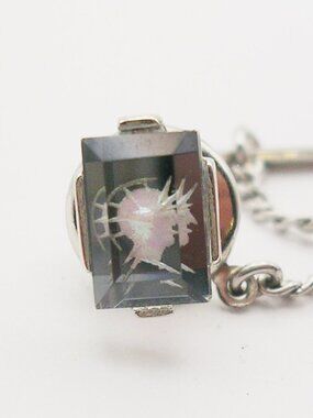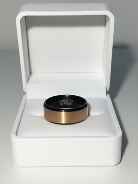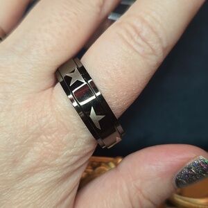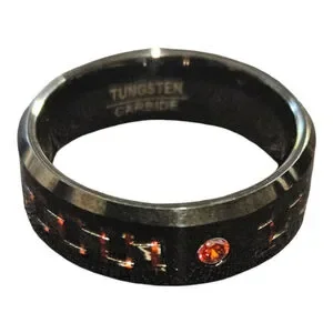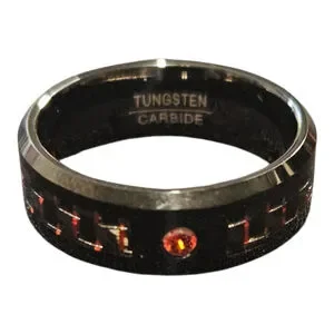 This is a black tungsten carbide ring featuring an red and silver-toned patterned inlay around its exterior. The pattern appears to be a series of interconnected lines and shapes. One image shows "TUNGSTEN CARBIDE" engraved on the inside of the band. The ring has a smooth, polished finish on the edges and interior, with a slightly textured surface on the patterned inlay. No visible imperfections or signs of wear are apparent.