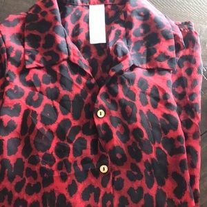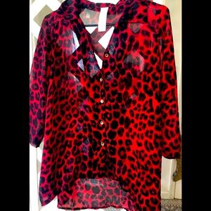 Red and black leopard print blouse with gold buttons. Semi-sheet, high-low style. In great condition.