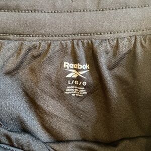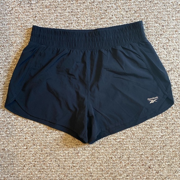 Black running shorts with underwear lining and small pocket in the interior of the shorts.