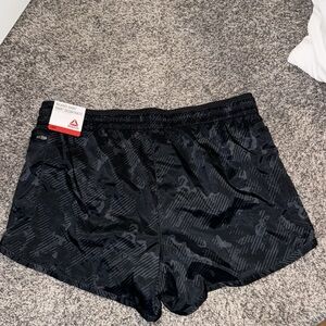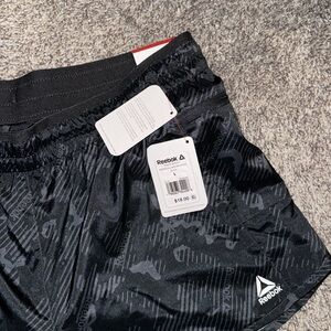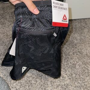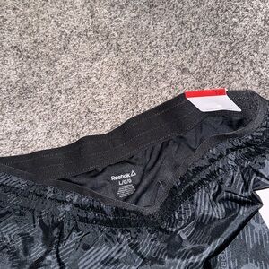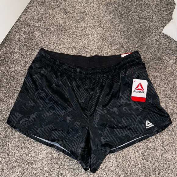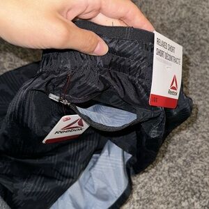 Never used/worn, black Reebok athletic shorts. Feels very comfortable and breathable. Has pockets on each side, one with a zipper for extra protection on valuables. Built in underwear and tie on waistband. Sweat proof due to material used.