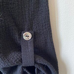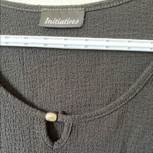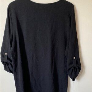 This black blouse features a relaxed fit with three-quarter sleeves, offering a versatile and comfortable style for any occasion. The buttoned design adds a touch of elegance, making it a perfect choice for both casual and semi-formal settings.