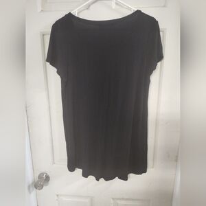 This black t-shirt features a relaxed fit and cap sleeves, offering a comfortable and stylish option for everyday wear. Its simple design makes it a versatile addition to any wardrobe, perfect for pairing with jeans or layering under a jacket. Long enough to wear with leggings or bike shorts.