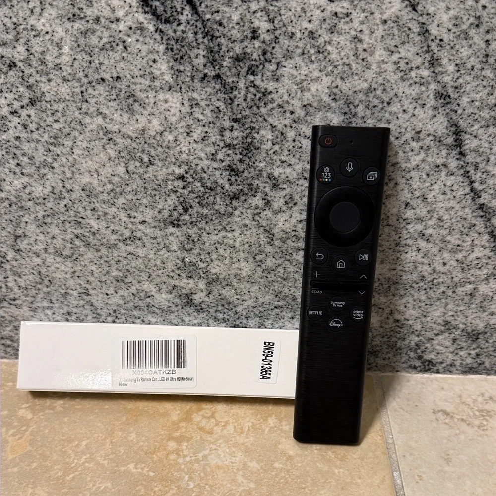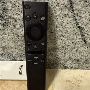 Sleek black remote control with intuitive buttons.
