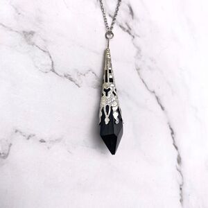 This elegant yet mysterious pendulum necklace is perfect for any witch, spiritualist, or divination enthusiast. The pendant features a black resin pendulum with a silver colored cone, measuring 2.25" x .5". It is suspended from an 18-inch nickel-free chain.