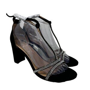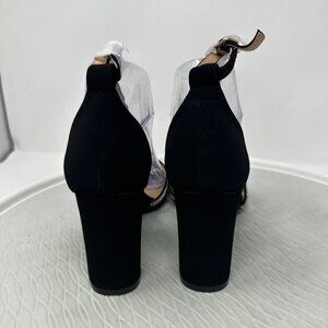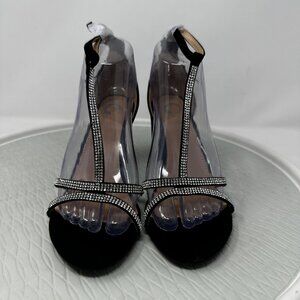 Black Rhinestone Ankle Strap Heels Size 8 Open Toe Clear PVC T-Strap
