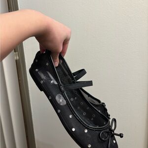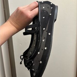 Elegant black ballet flats adorned with sparkling rhinestones. Perfect for adding a touch of glamour to any outfit.