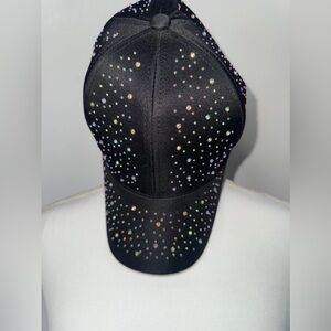 Black baseball cap with scattered iridescent rhinestones. Sparkly finish that catches the light. Classic six-panel shape with curved brim. Stylish and versatile accessory.
