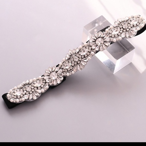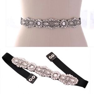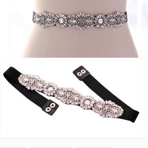 Black rhinestone stretch belt.fits up to 34 inch waist! Has two back snaps. Very good quality. Can be added to any dress or gown.