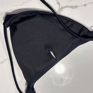 Material is a blend of polyester and spandex, offering a soft and stretchy feel. Adjustable ties at the neck and adjustable side ties on the bottom allow for a customizable fit. The triangle cut is designed to enhance natural curves.