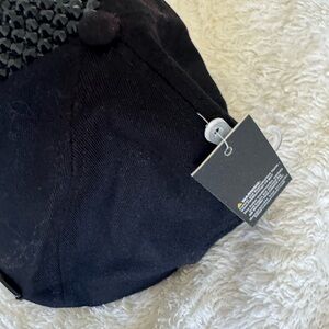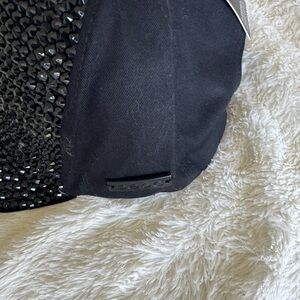 Stylish black cap adorned with sparkling rhinestones. Perfect for adding a touch of glamour to any outfit.