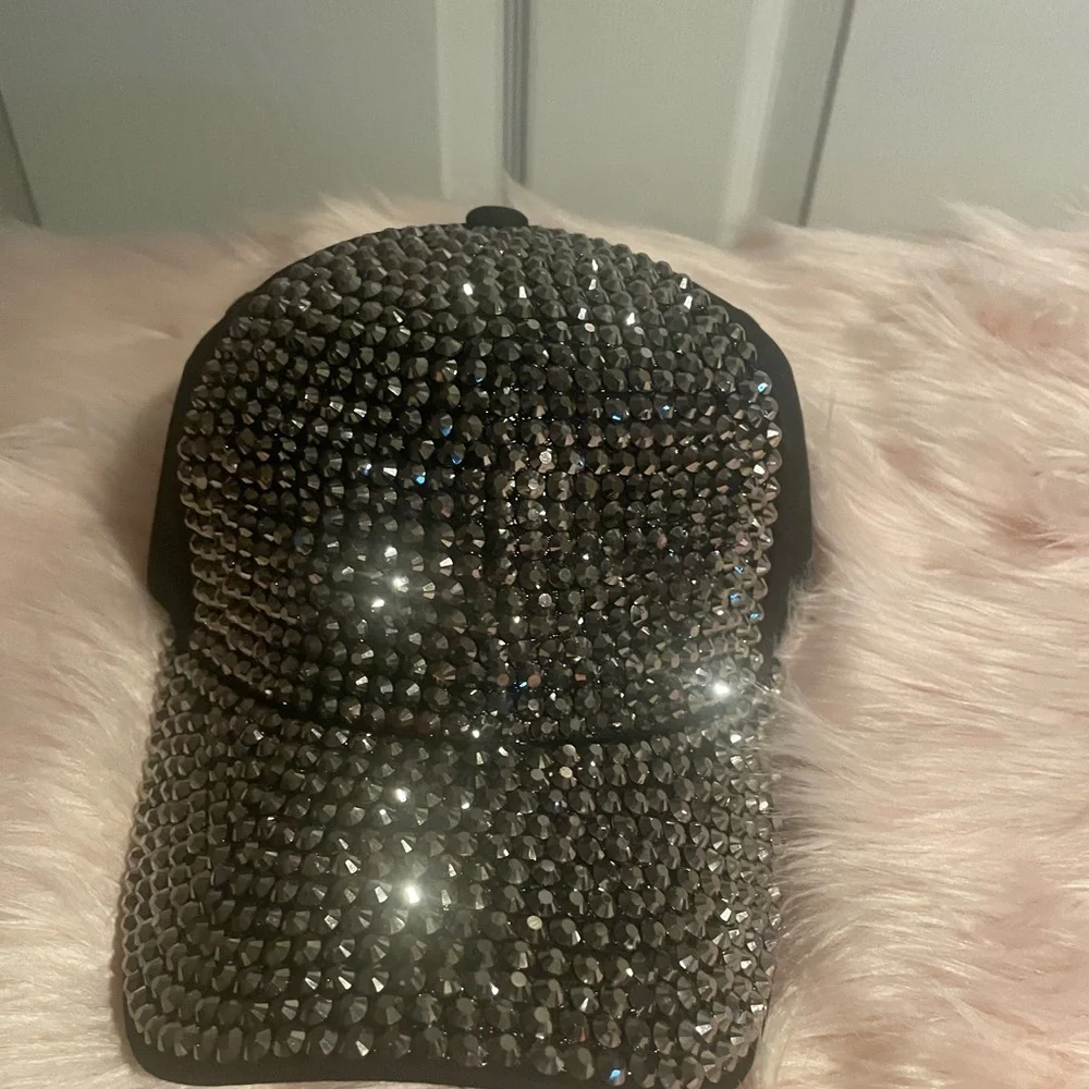 Stylish black cap adorned with sparkling rhinestones. Perfect for adding a touch of glamour to any outfit. (Never Worn)