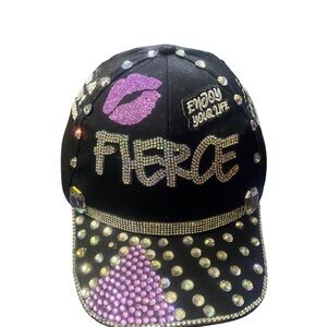 Stylish black cap with rhinestone embellishments. Features purple and silver accents with bold 'Fierce' design. ( Custom Made )