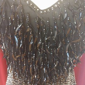 Sweetheart style black dress decorated with rhinestones and beaded tendrils on the chest.