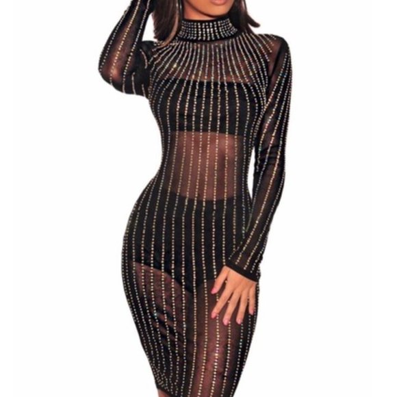 Command attention in this striking Black Rhinestone Mock Neck Long Sleeve Dress! 💎 The iridescent rhinestones shimmer and shine, ensuring you make a sleek yet sexy statement wherever you go. With its mock neckline, sheer mesh bodice, and long sleeves, this dress exudes elegance and allure. Crafted from high elastic fabric, it hugs and accentuates every curve for a flattering fit. Perfect for special occasions or a night out, this sexy sheer dress is adorned with shimmering rhinestones that add an extra touch of glamour.