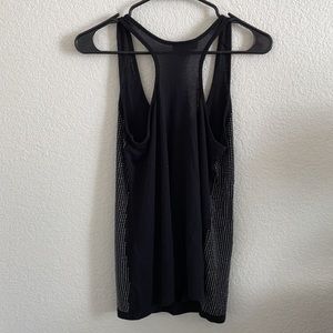 Says size small but fits like a Medium. Fabric does provide stretch. no missing rhinestones! excellent condition. Lightweight, soft.