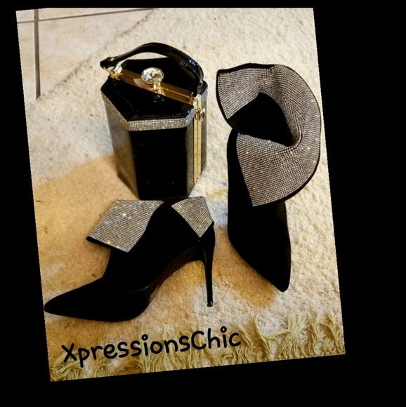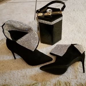 Black 4.5 inch heel Faux Suede, Rhinestone Flap Shubootie