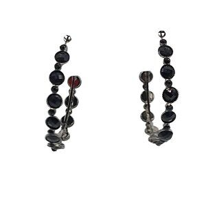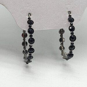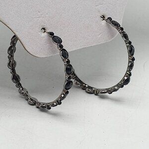 Black Rhinestone Silver-Tone Hoop Earrings 2" Round Vintage 1980s