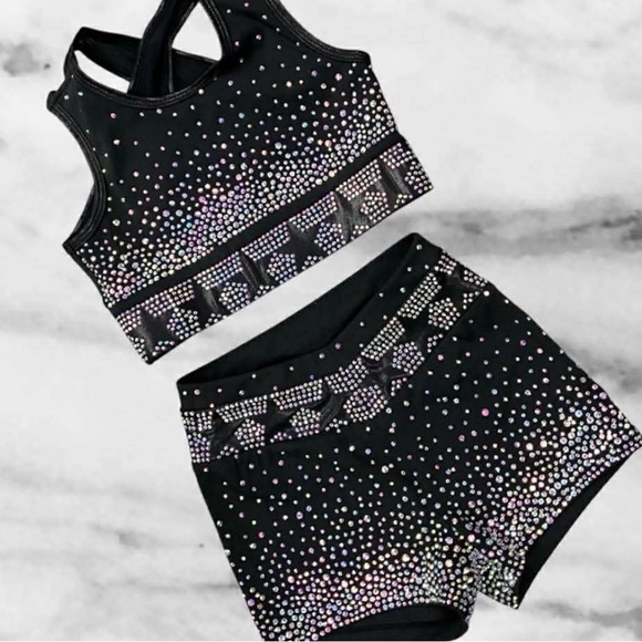 Black crop tank and matching shorts. Covered in iridescent rhinestones for sparkle. Stretchy performance fabric. Sleek, stage-ready look.