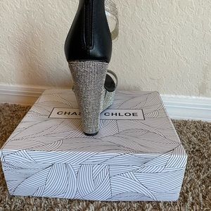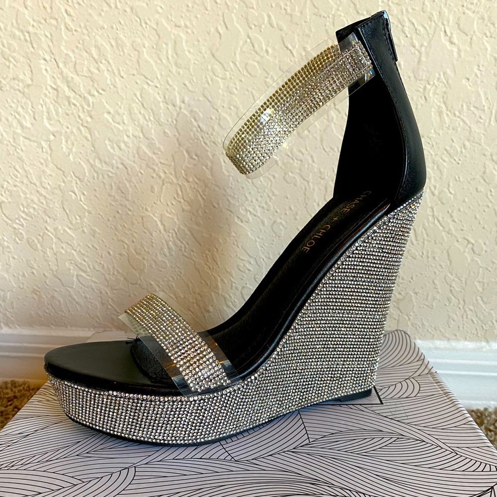 Brand new, never worn, still in original shoebox. Beautiful high heel, ankle wrapped wedges with sparkling rhinestones