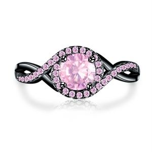 Black Rhodium & pink CZ swirl ring Size 6-9. Stunning pink ice CZ surrounded by a swirl of smaller light pink stones. Black rhodium finish on this really really makes it pop. Beautiful ring in Sizes 6-10.