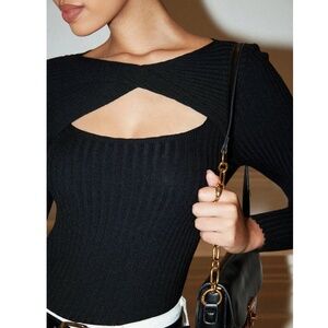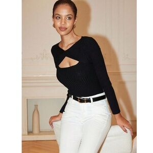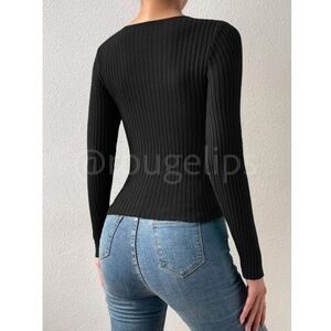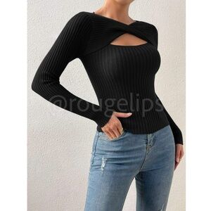 Black Rib Knit Cut Out Keyhole Twisted Detail Long Sleeve Light Sweater Top