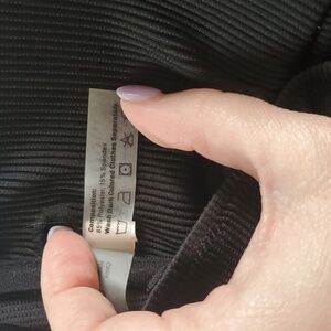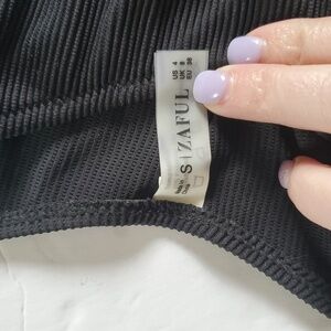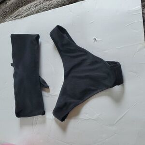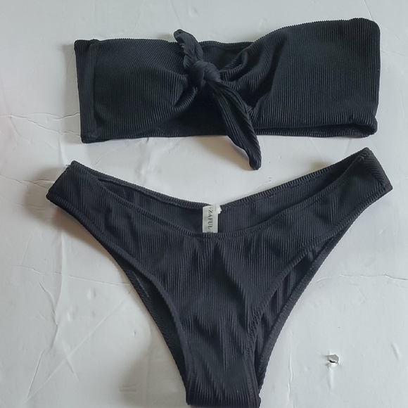 Stylish black ribbed bikini set. Features a bandeau top with a knot detail and matching bottoms.